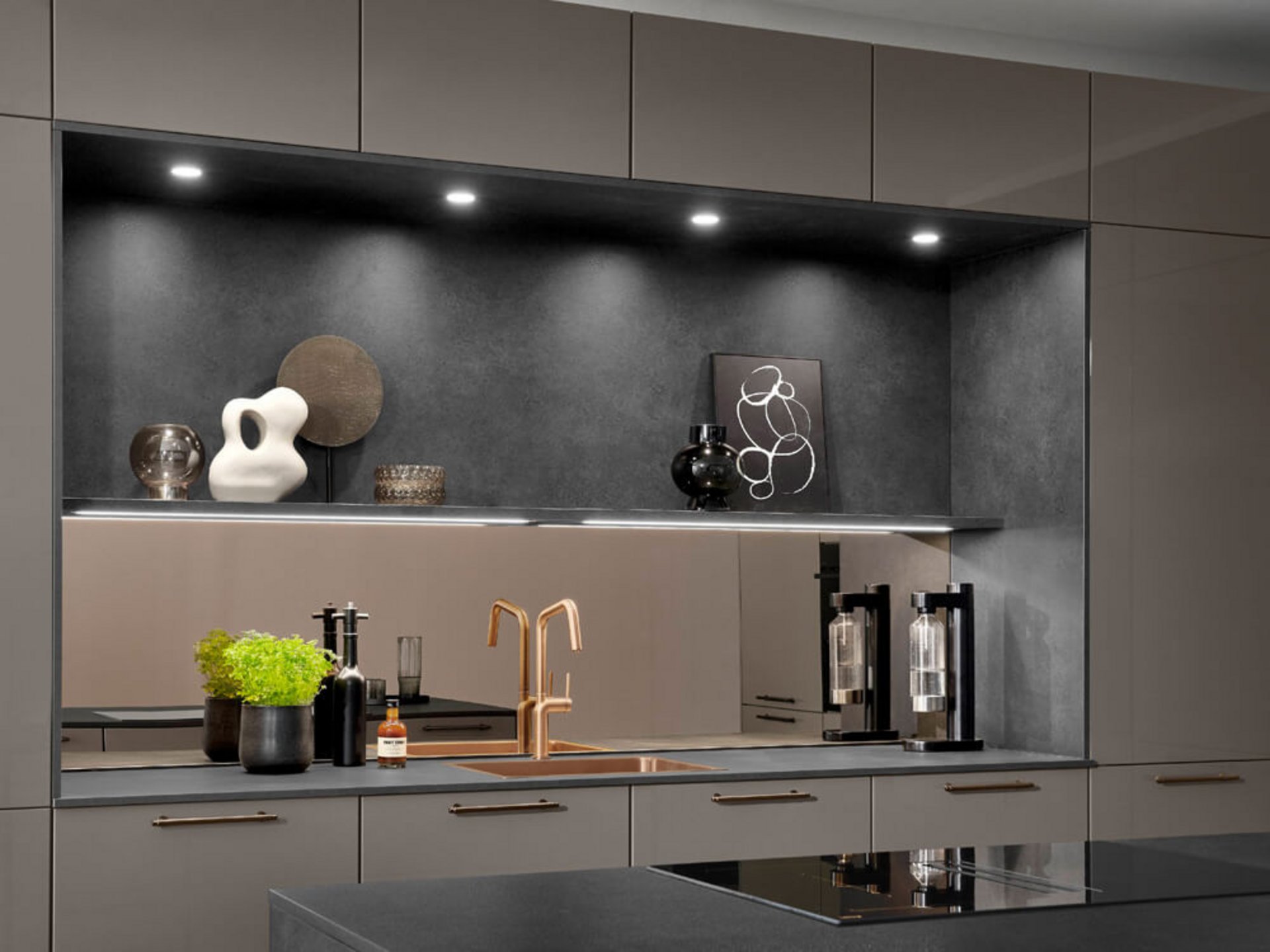 Der erste Eindruck wirkt ruhig. Fast reduziert. Die großflächigen Fronten in warmem Taupe-Hochglanz bilden eine elegante Wandgestaltung. Hochschränke integrieren Backofen und Stauraum flächenbündig. Im Zentrum öffnet sich eine dunkle Nische mit indirekter Beleuchtung. Sie setzt einen bewussten Kontrast zur hellen Front.