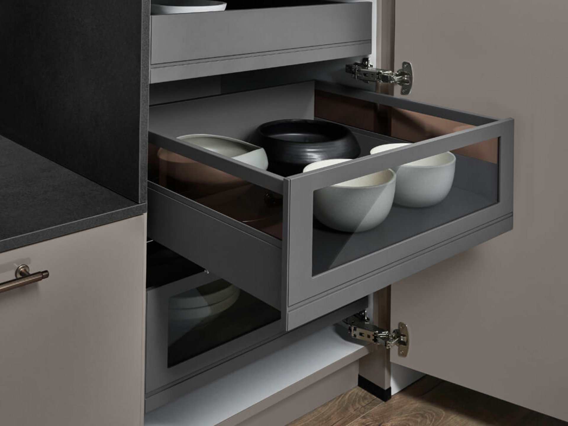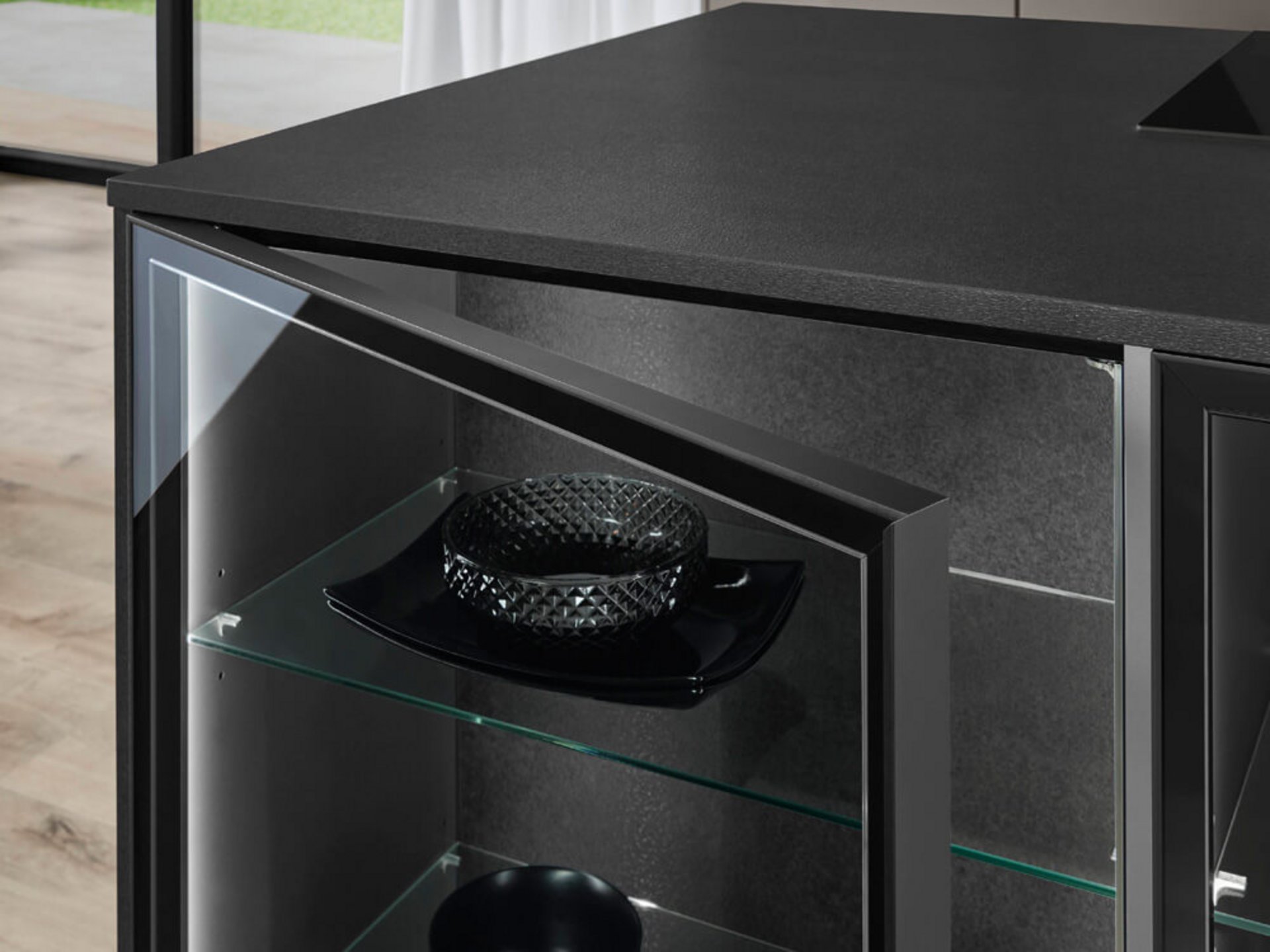 Auch im Inneren überzeugt das Konzept. Der Auszug mit Glasrahmen kombiniert Funktion mit Eleganz. Schalen und Geschirr werden nicht versteckt, sondern stilvoll präsentiert. Die gedämpften Beschläge sorgen für sanftes Öffnen und Schließen. Hochwertige Verarbeitung wird spürbar. Jede Bewegung fühlt sich kontrolliert und wertig an.