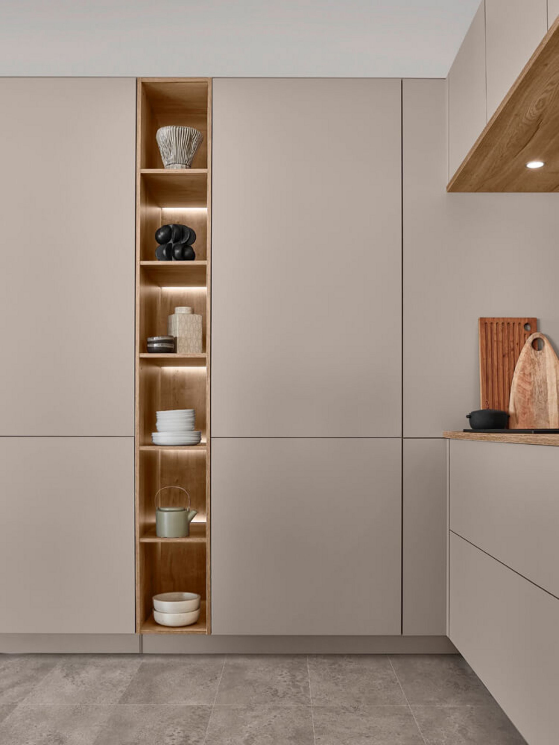 Ein schmales, beleuchtetes Regal unterbricht die geschlossene Front der Hochschränke. Es dient als Galerie für Ihre Lieblingsstücke, vom Teeservice bis zur Design-Vase. Das warme Licht schafft Tiefe und sorgt am Abend für eine stimmungsvolle indirekte Beleuchtung. Solche vertikalen Elemente strecken den Raum optisch und verleihen der Küche eine individuelle Note.