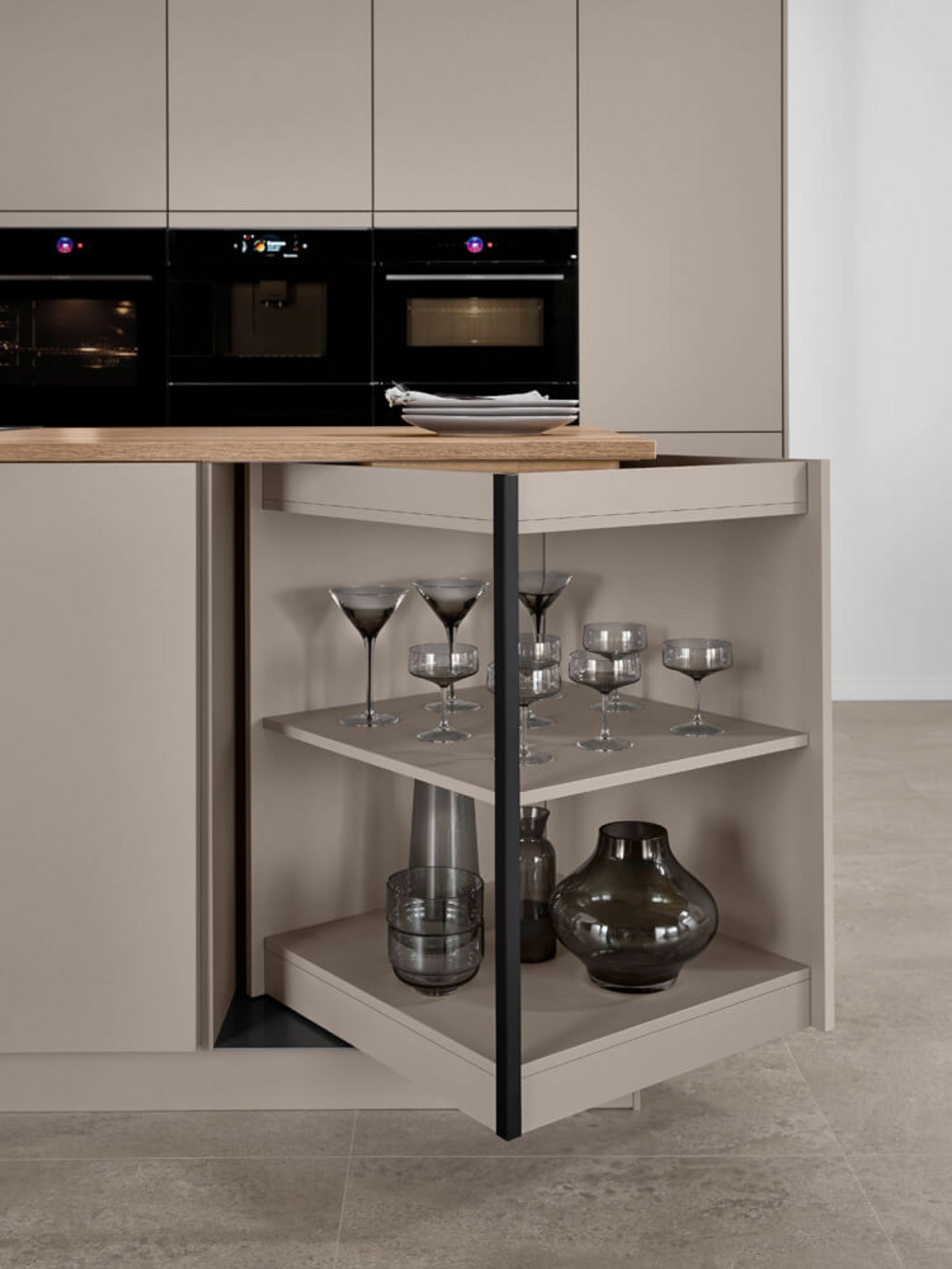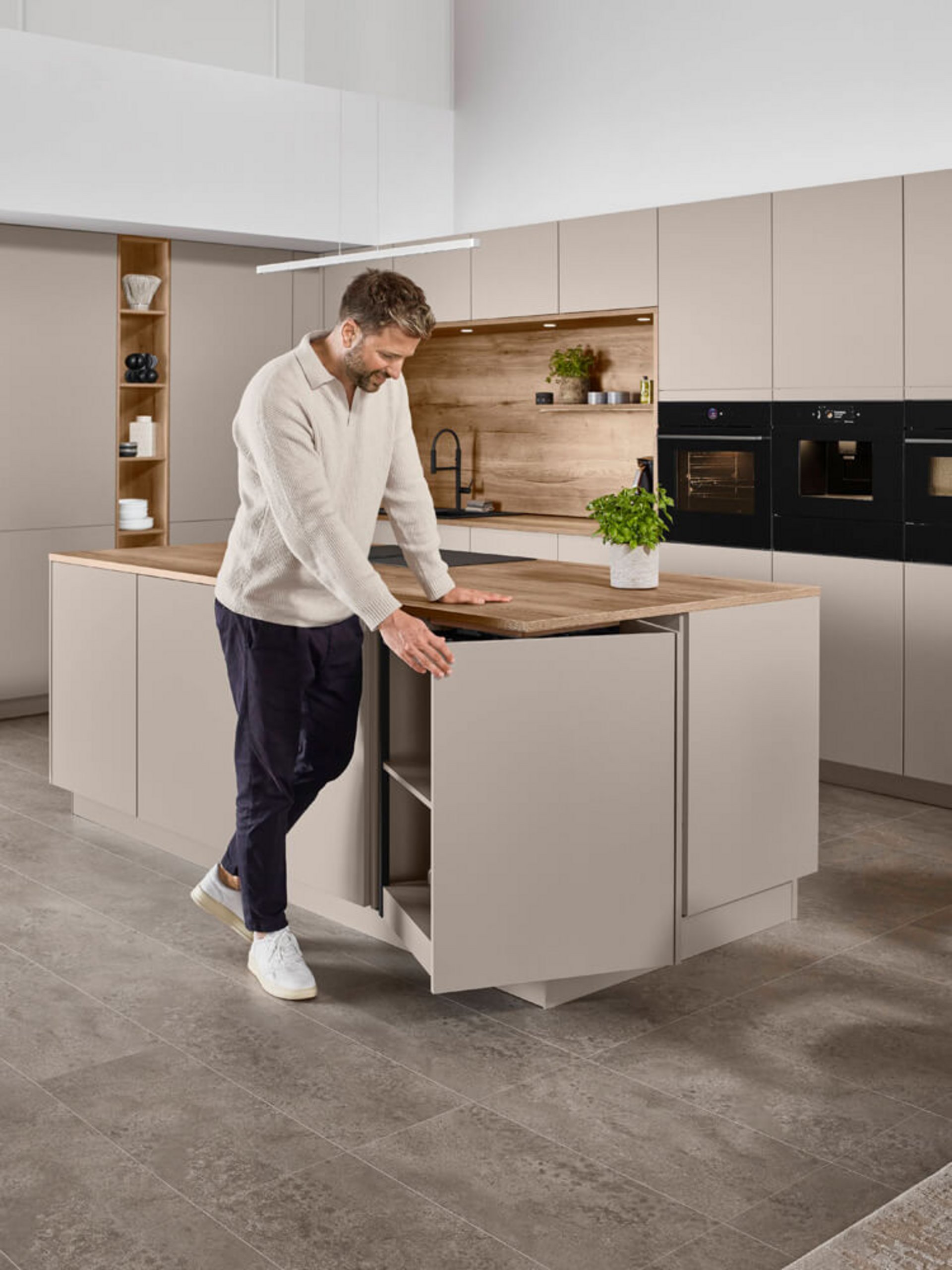 Die Bedienung der Senso 483 ist intuitiv und komfortabel. Ein leichter Druck genügt, um die großzügigen Auszüge zu öffnen. Die Arbeitshöhe ist ergonomisch optimiert, um den Rücken beim Vorbereiten der Speisen zu entlasten. Hier wird deutlich, dass der Mensch im Mittelpunkt der Planung steht. So macht die tägliche Küchenarbeit einfach Freude.