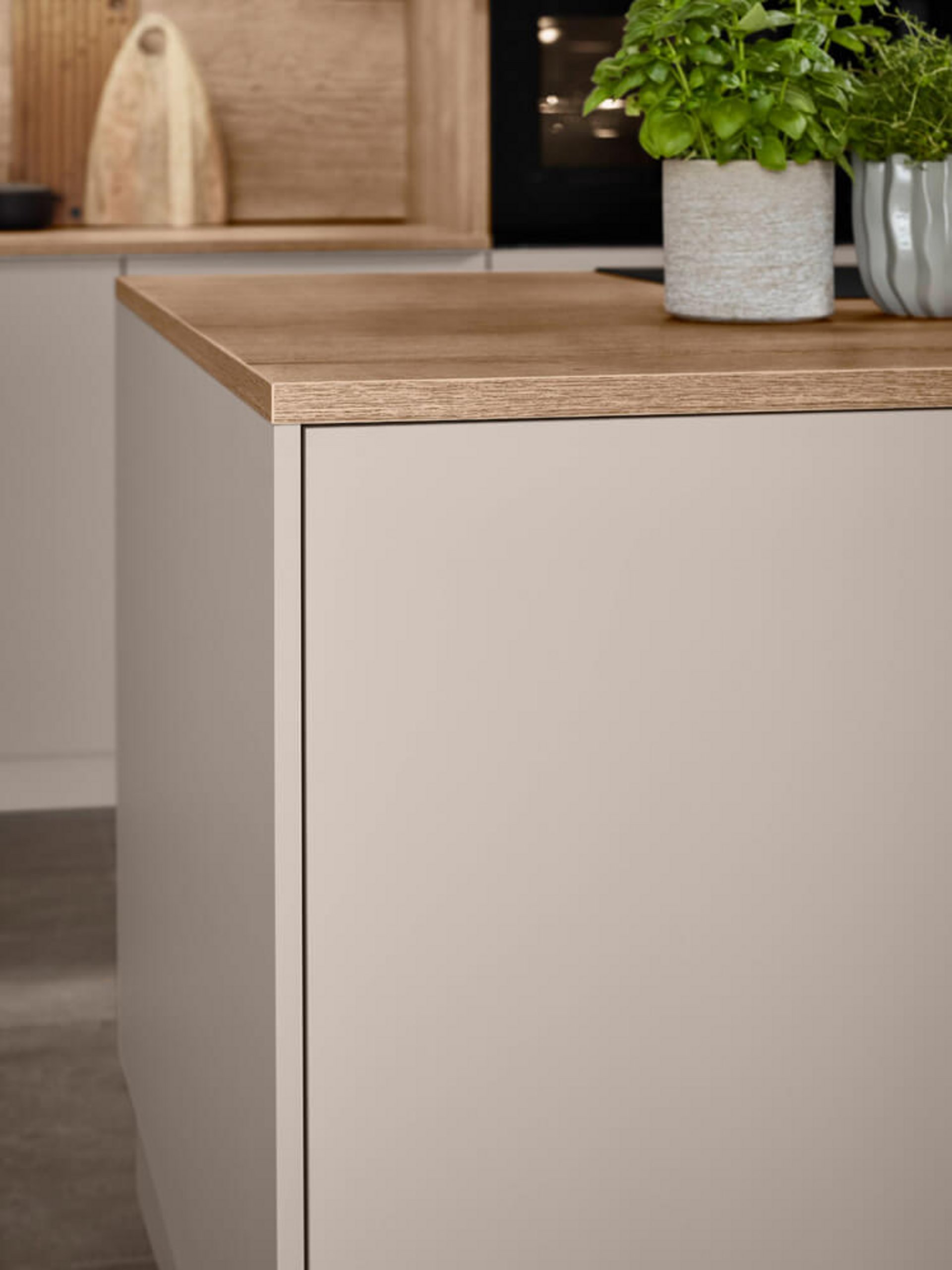 Der nahe Blick auf die Kantenverarbeitung zeigt die hochwertige Präzision. Die Arbeitsplatte schließt bündig mit der Front ab, was die moderne Optik unterstreicht. Die Materialkombination wirkt natürlich und hochwertig zugleich. Es sind diese feinen Nuancen, die den Unterschied zwischen einer Standardküche und einer Designküche ausmachen.