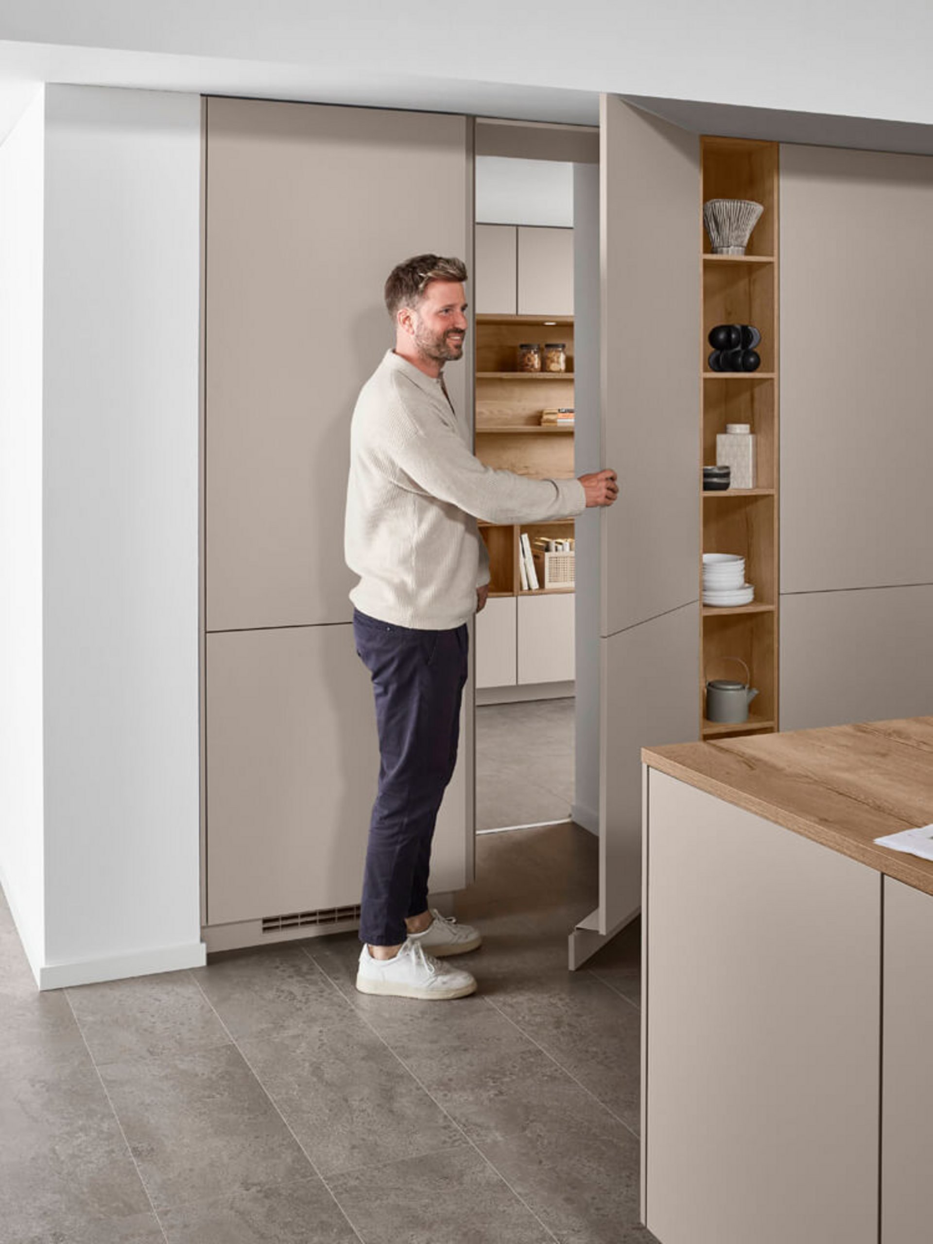 Ein besonderes Highlight ist die Integration einer Durchgangstür in der Schrankfront. Dahinter verbirgt sich oft eine Speisekammer oder ein Hauswirtschaftsraum. Welche Vorteile dies mit sich bringt, haben wir in einem eigenen Expertenbeitrag „Multifunktionaler Hauswirtschaftsraum“ beschrieben. Im geschlossenen Zustand bleibt die Optik der Küchenwand völlig ungestört. Diese architektonische Lösung sorgt für Ruhe im Design und verbirgt geschickt die funktionalen Bereiche des Haushalts.