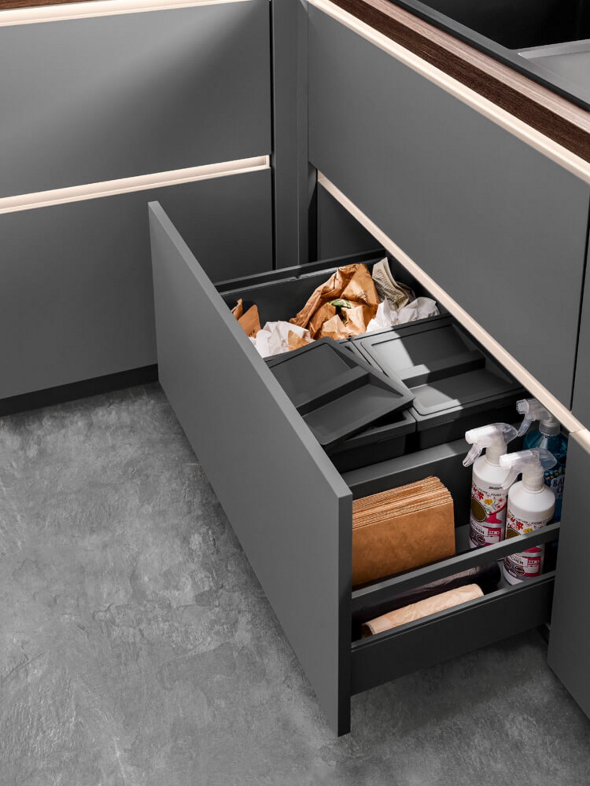 Eine durchdachte Lösung für den Bereich unter der Spüle: Die herausziehbare Schublade bietet Platz für Mülltrennungssysteme und Reinigungsutensilien. Mehrere Fächer sorgen für eine klare Trennung von Wertstoffen und Restmüll. Zusätzlicher Stauraum im unteren Bereich ermöglicht das ordentliche Verstauen von Putzmitteln und Papierrollen. Die grifflosen, matten Fronten in Schiefergrau unterstreichen das moderne, minimalistische Design. Dank der stabilen Führungssysteme gleiten die Schubladen sanft und leise, selbst bei voller Beladung.