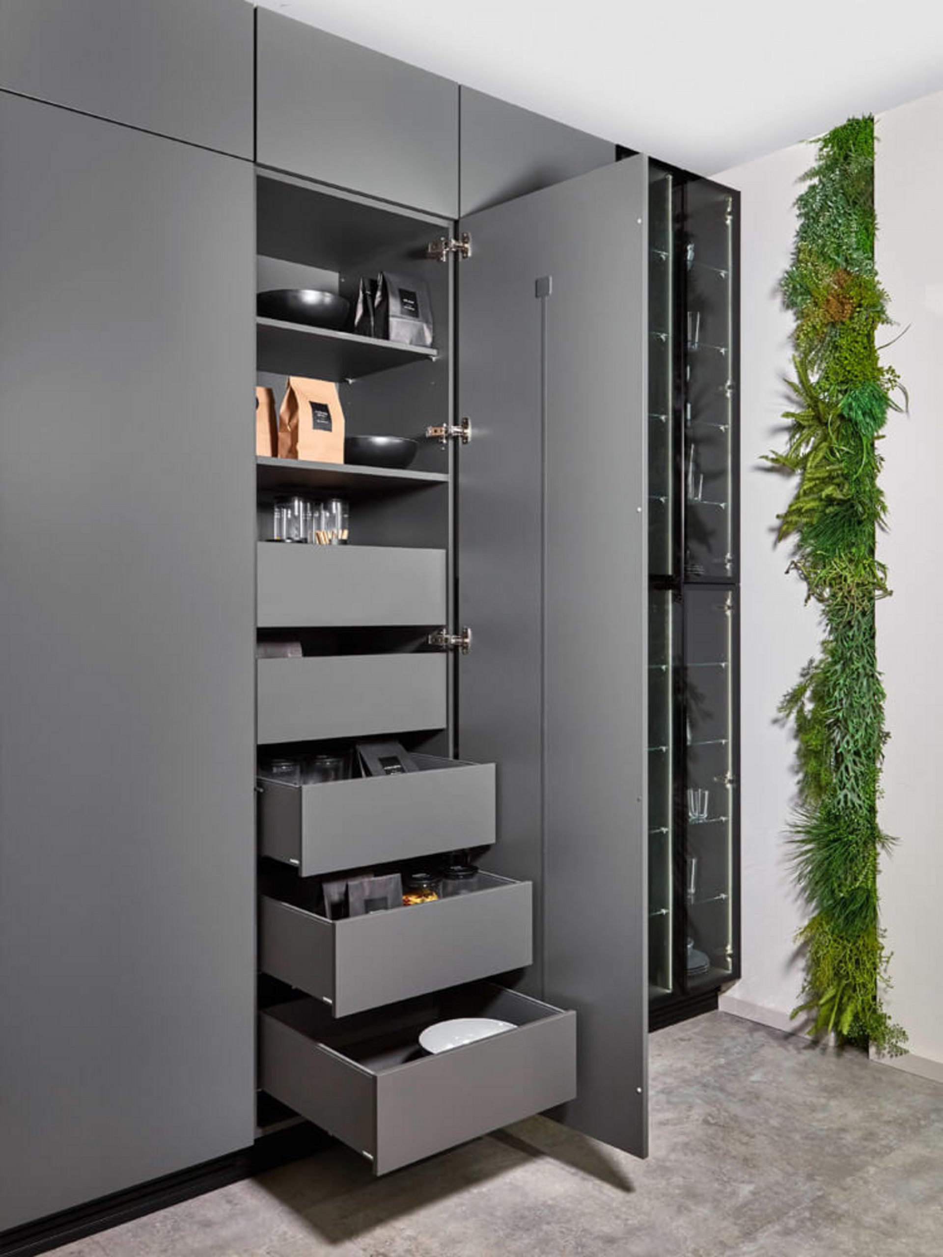 In den passgenauen Hochschränken zeigt sich, wie durchdachte Stauraumlösungen Ihren Küchenalltag erleichtern können. Mehrere Einlegeböden und geräumige Schubladen bieten Platz für Geschirr, Vorräte und Küchenutensilien. Die Front in edlem Schiefergrau matt harmoniert mit dem modernen, grifflosen Design. Dank der intelligenten Innenaufteilung bleibt alles übersichtlich und griffbereit. Die sanft schließenden Scharniere sorgen für ein angenehmes und geräuschloses Handling. So bleibt die Küche stets aufgeräumt, ohne an Ästhetik einzubüßen.