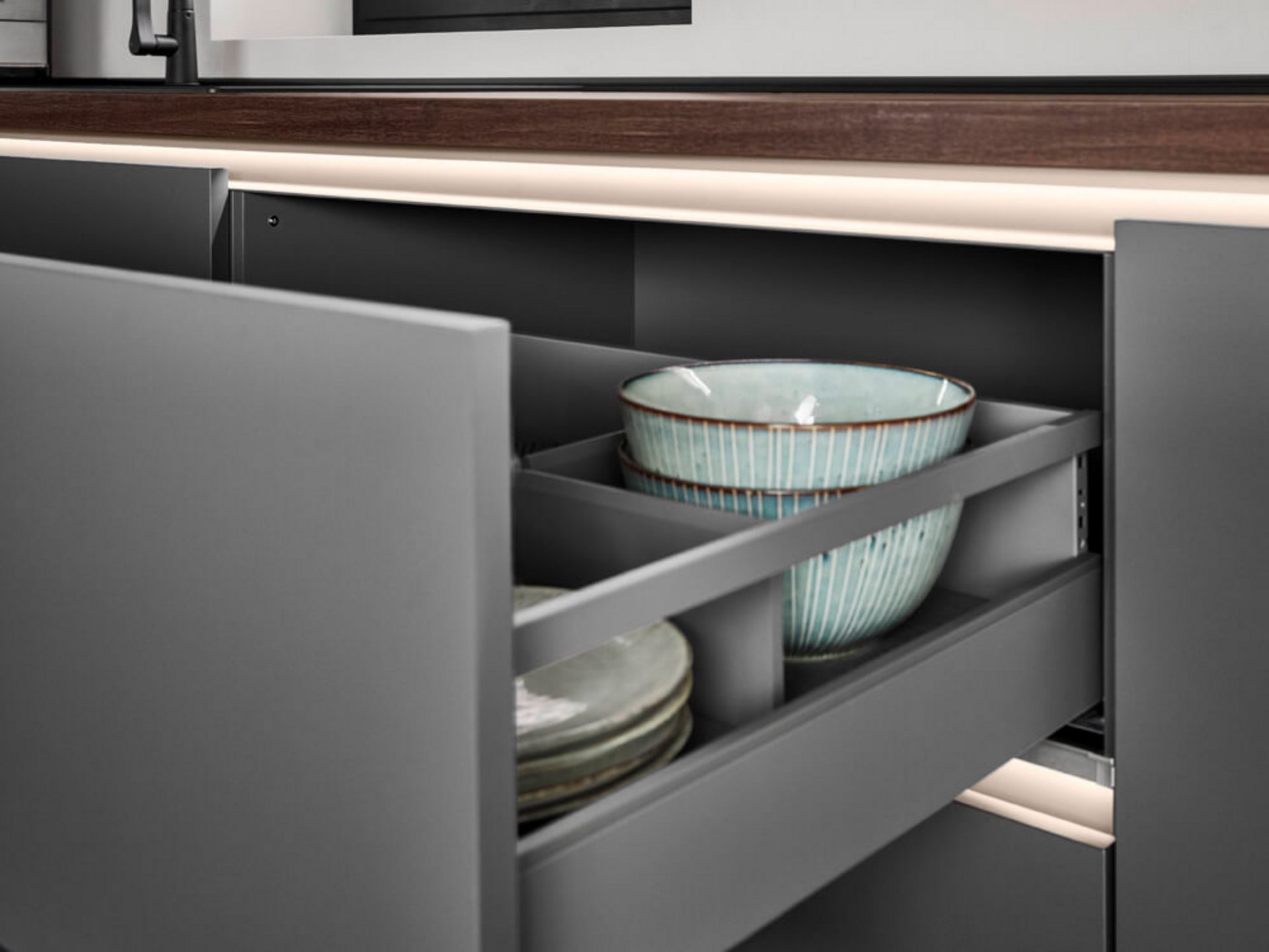 Die Fronten in Schiefergrau Premium Matt verleihen der Küche Senso 491 eine edle und zugleich zurückhaltende Optik. Die samtige Haptik der Oberflächen lädt zum Berühren ein und vermittelt ein Gefühl von Wärme und Behaglichkeit.