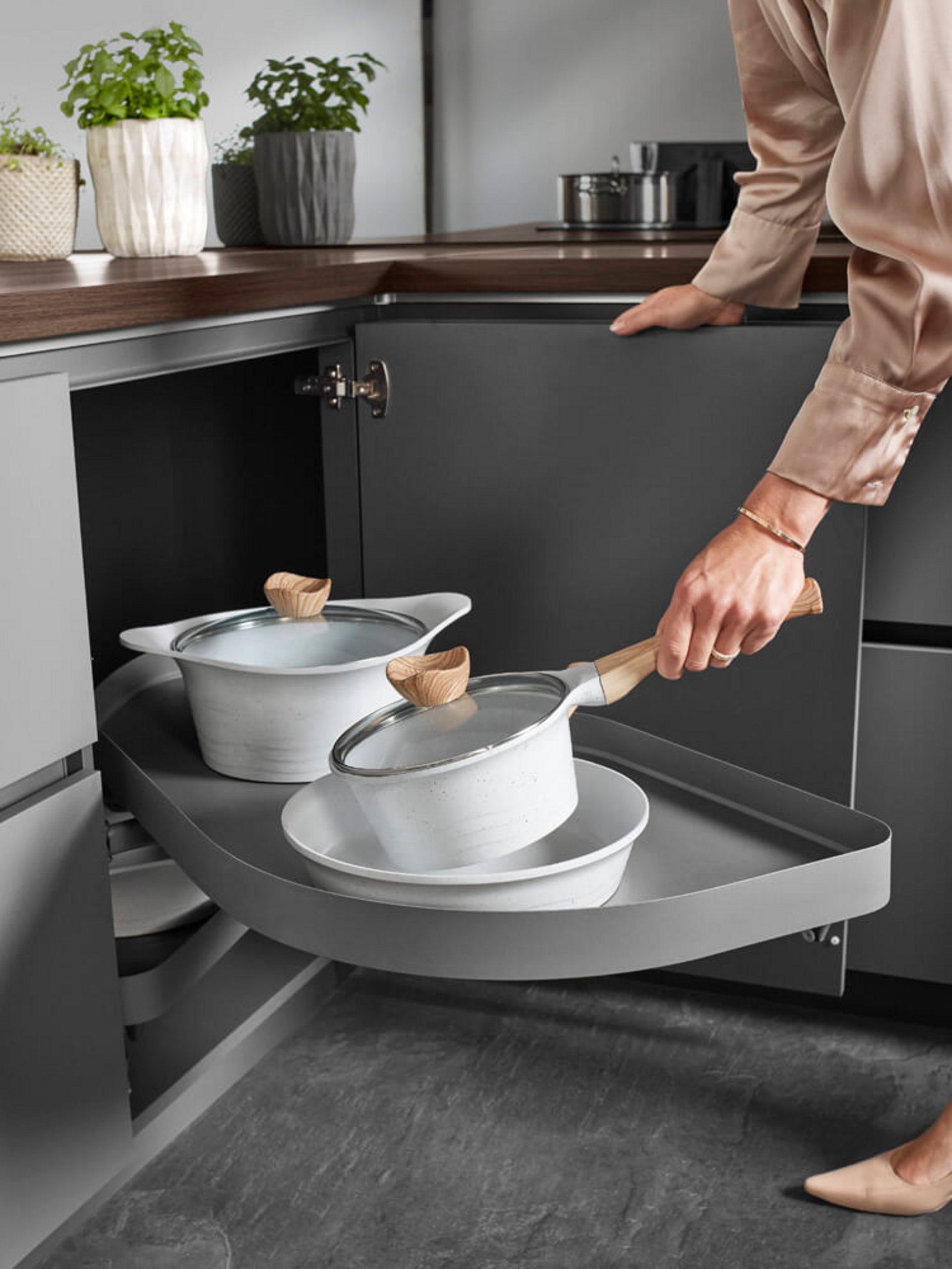 Diese Ecklösung gehört zu den beliebtesten Stauraum-Innovationen, weil sie den oft ungenutzten Platz in der Küche effizient erschließt. Sie eignet sich besonders für kleinere Küchen oder für alle, die eine durchdachte und gut organisierte Kochumgebung schätzen. Ein echtes Highlight für jede durchdacht geplante Küche.