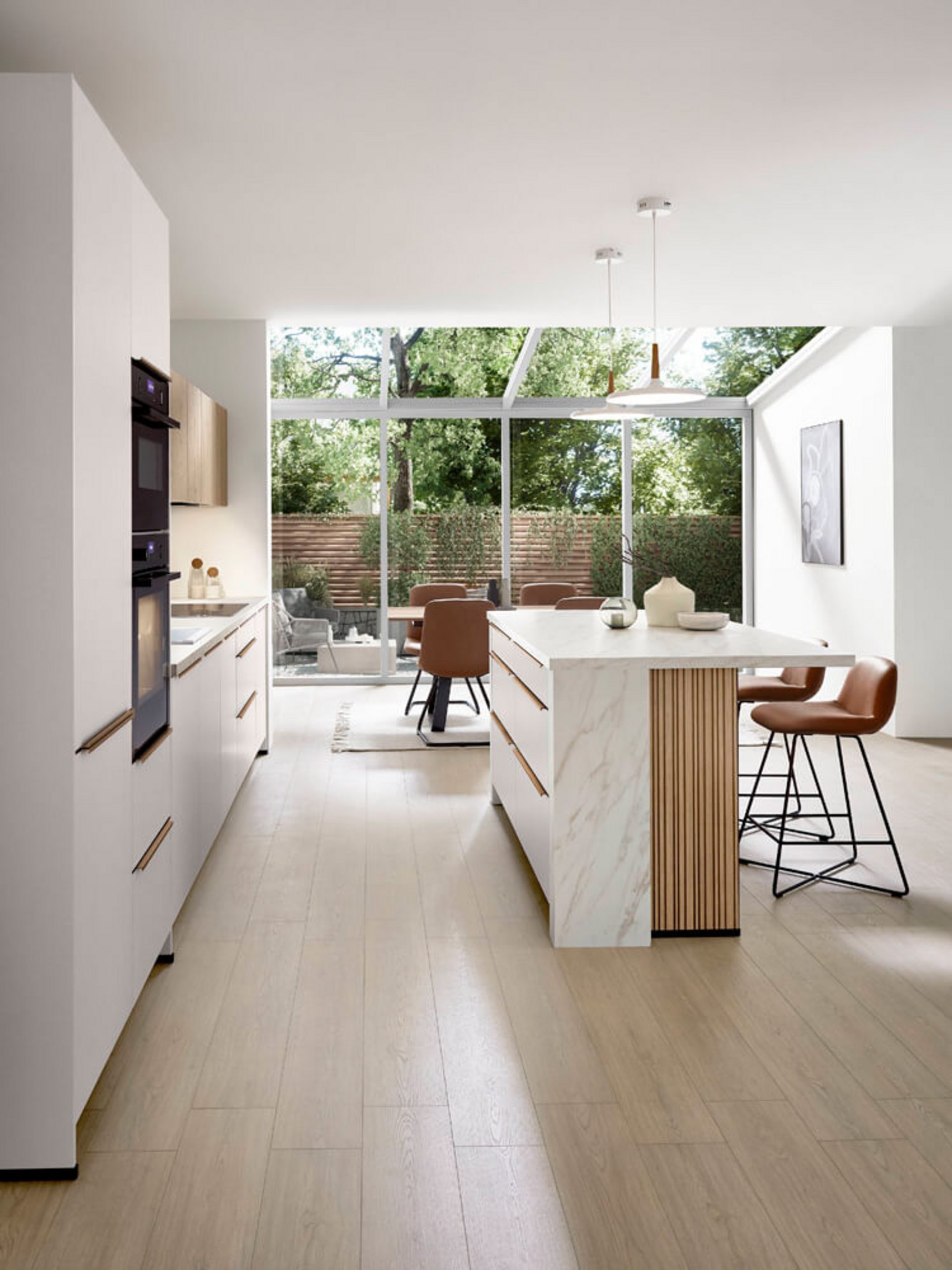 Ein Highlight dieser Küche ist die stilvolle Kochinsel mit einer hochwertigen Marmoroptik. Sie bietet nicht nur eine großzügige Arbeitsfläche, sondern auch optimalen Stauraum. Perfekt für die Zubereitung Ihrer Speisen oder als kommunikativer Mittelpunkt für Ihre Familie und Gäste. Dank der durchdachten Schubladensysteme können Kochutensilien, Teller und Zubehör geordnet und griffbereit verstaut werden. Die vertikalen Holzrillen an der Stirnseite der Insel setzen einen modernen, aber natürlichen Akzent.