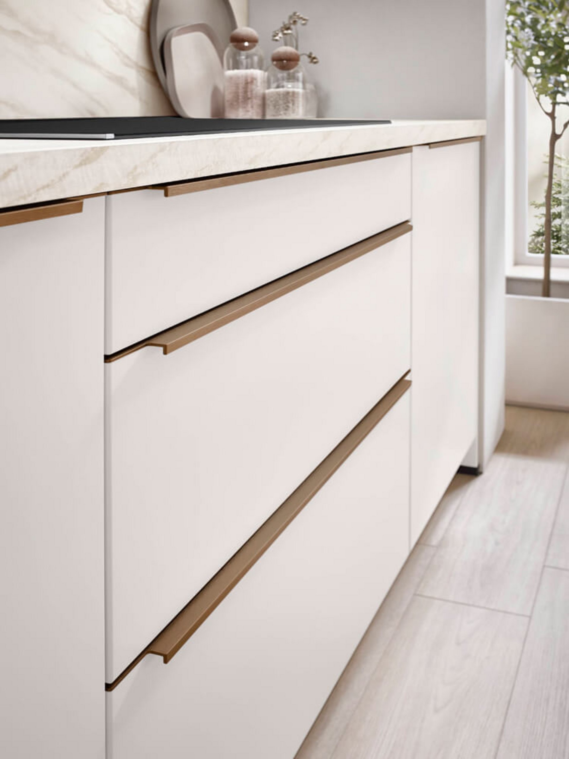 Die Griffleisten in Bronze Metallic harmonieren perfekt mit der hochwertigen Armatur, die in derselben Farbgebung gehalten ist. Diese durchdachte Farb- und Materialwahl verleiht der Küche eine warme und exklusive Ausstrahlung.